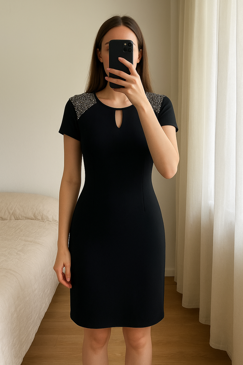 Robe de soirée ou fêtes noire neuve manches courtes debout, face à la caméra, dans une chambre à la lumière douce, avec une lumière naturelle filtrant par la fenêtre.