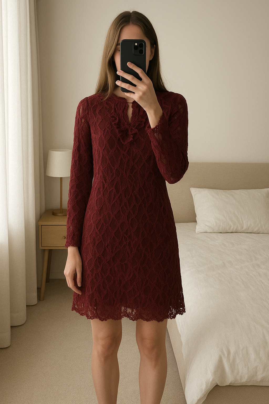 Robe dentelle VILA Taille 38 debout, face à la caméra, dans une chambre à la lumière douce, avec une lumière naturelle filtrant par la fenêtre.