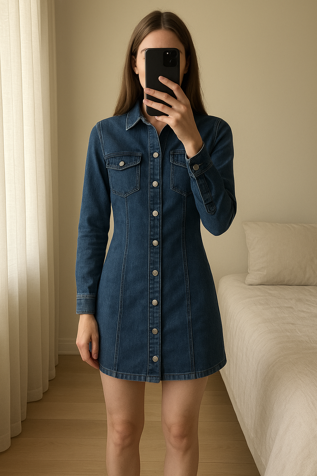 Robe en jean Pepe Jeans taille s. Très bon état. debout, face à la caméra, dans une chambre à la lumière douce, avec une lumière naturelle filtrant par la fenêtre.