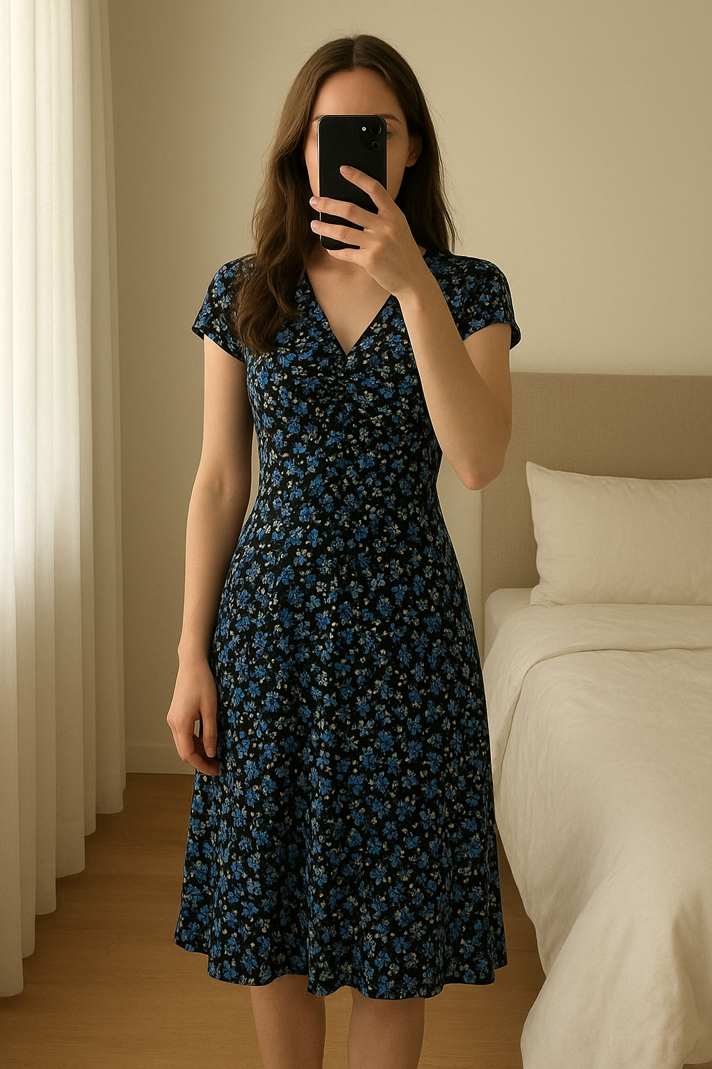 Robe fleurie bleue debout, face à la caméra, dans une chambre à la lumière douce, avec une lumière naturelle filtrant par la fenêtre.