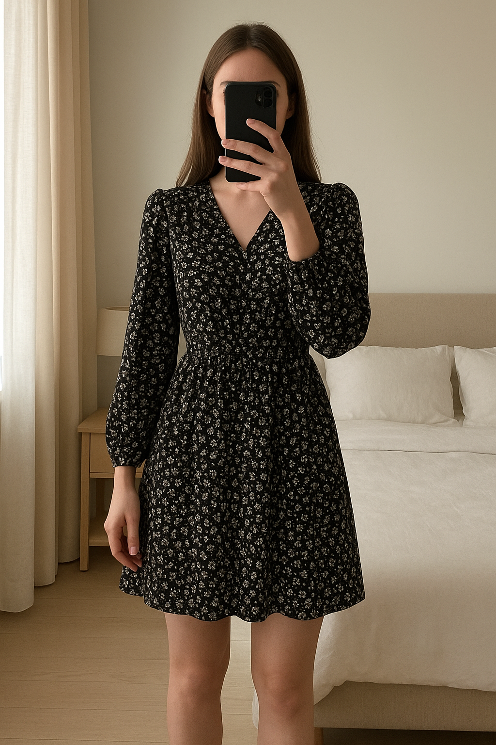Robe à fleurs debout, face à la caméra, dans une chambre à la lumière douce, avec une lumière naturelle filtrant par la fenêtre.