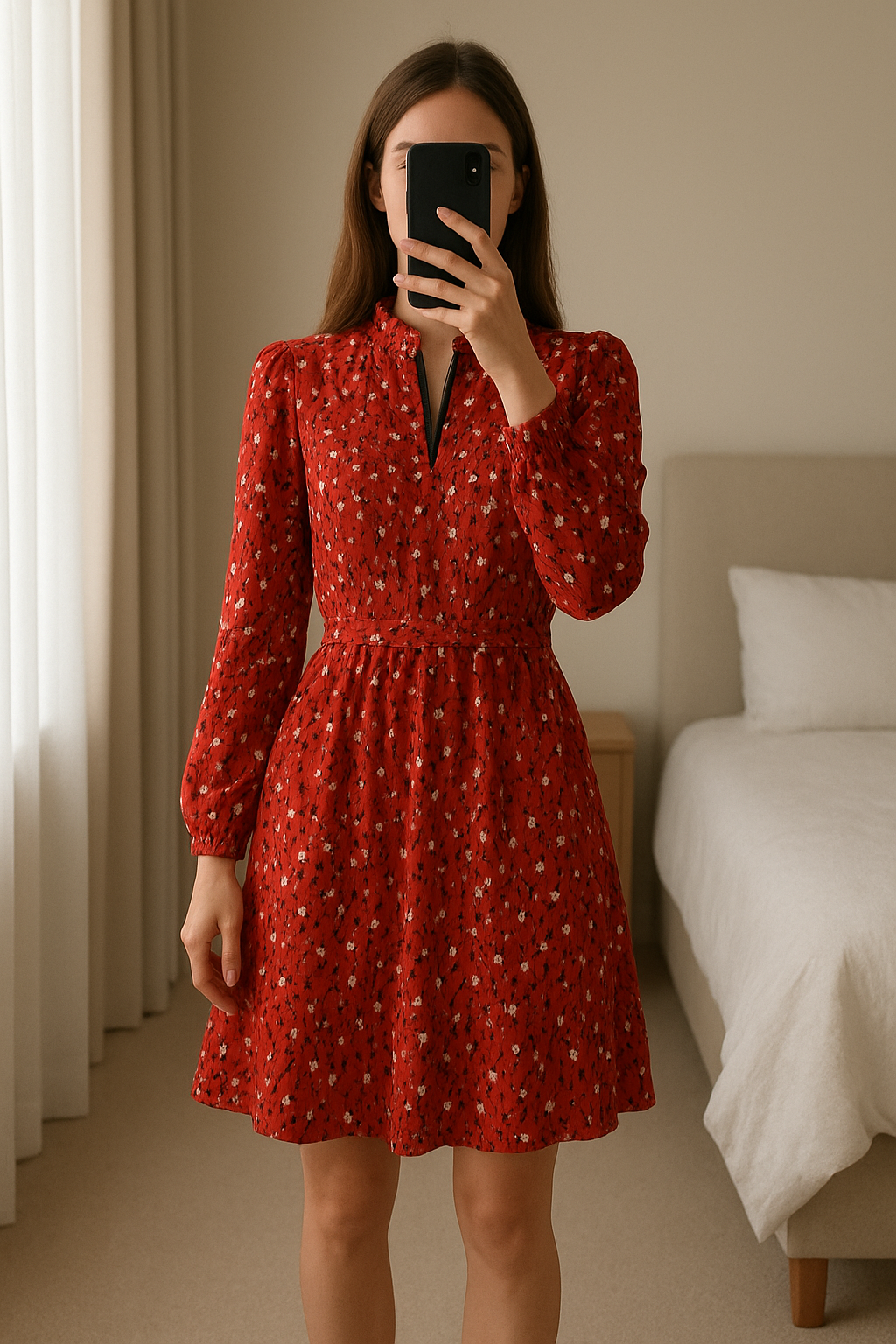 Robe à fleurs / liberty/ rose debout, face à la caméra, dans une chambre à la lumière douce, avec une lumière naturelle filtrant par la fenêtre.
