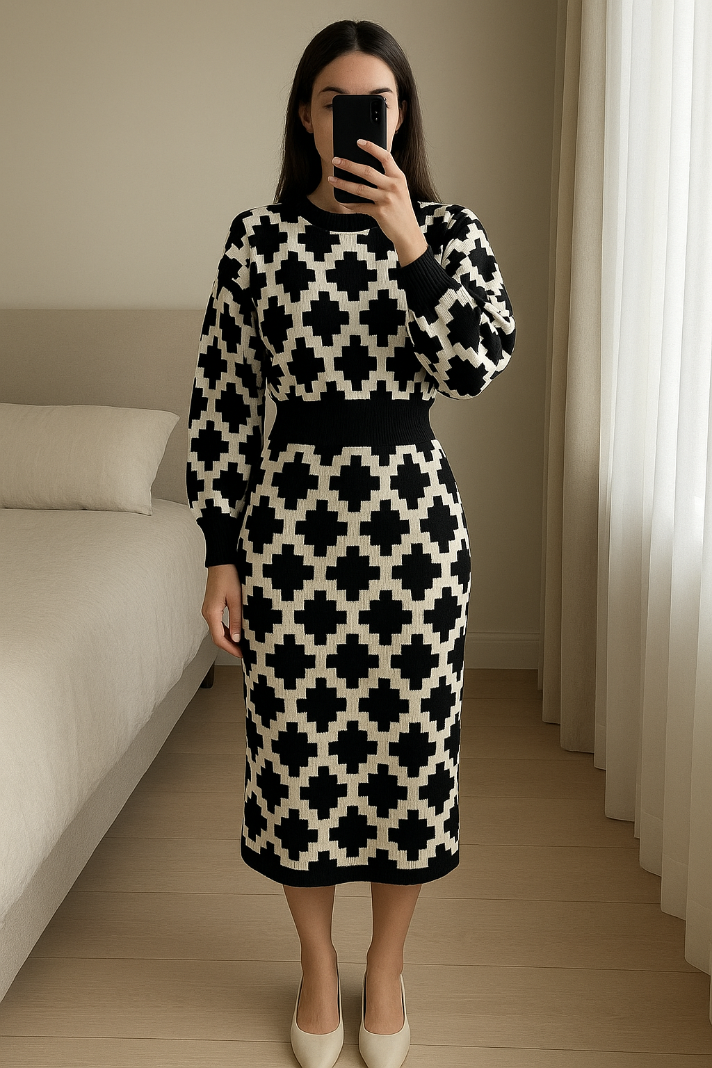 Robe graphique 38 noire et blanche debout, face à la caméra, dans une chambre à la lumière douce, avec une lumière naturelle filtrant par la fenêtre.