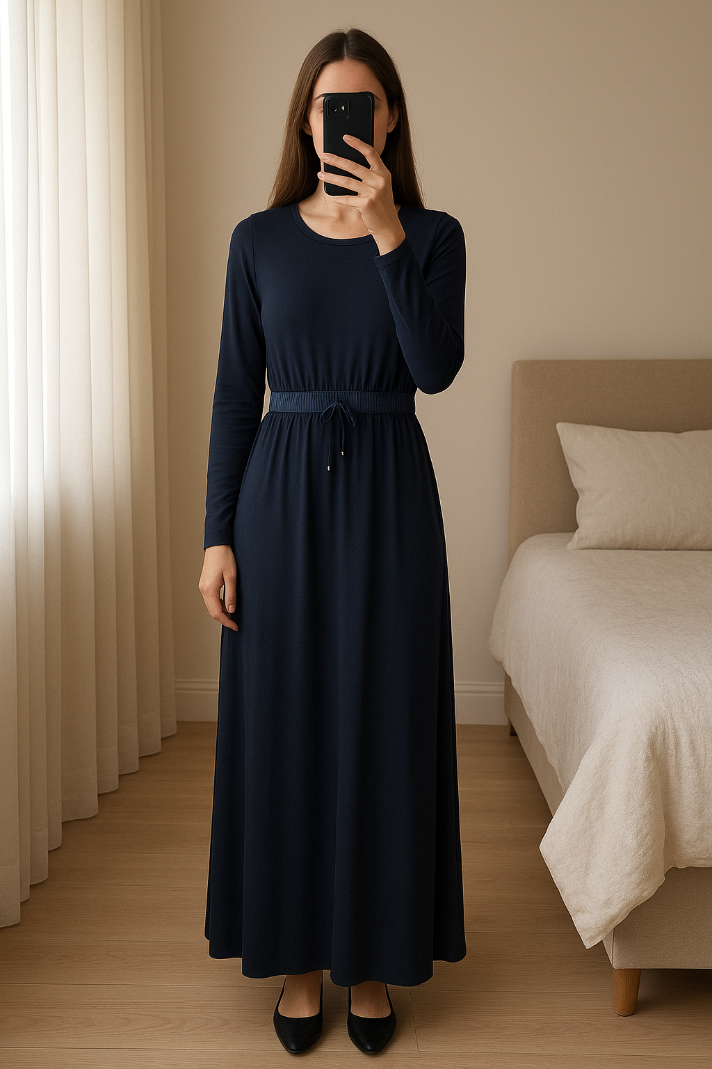 Robe hassa debout, face à la caméra, dans une chambre à la lumière douce, avec une lumière naturelle filtrant par la fenêtre.