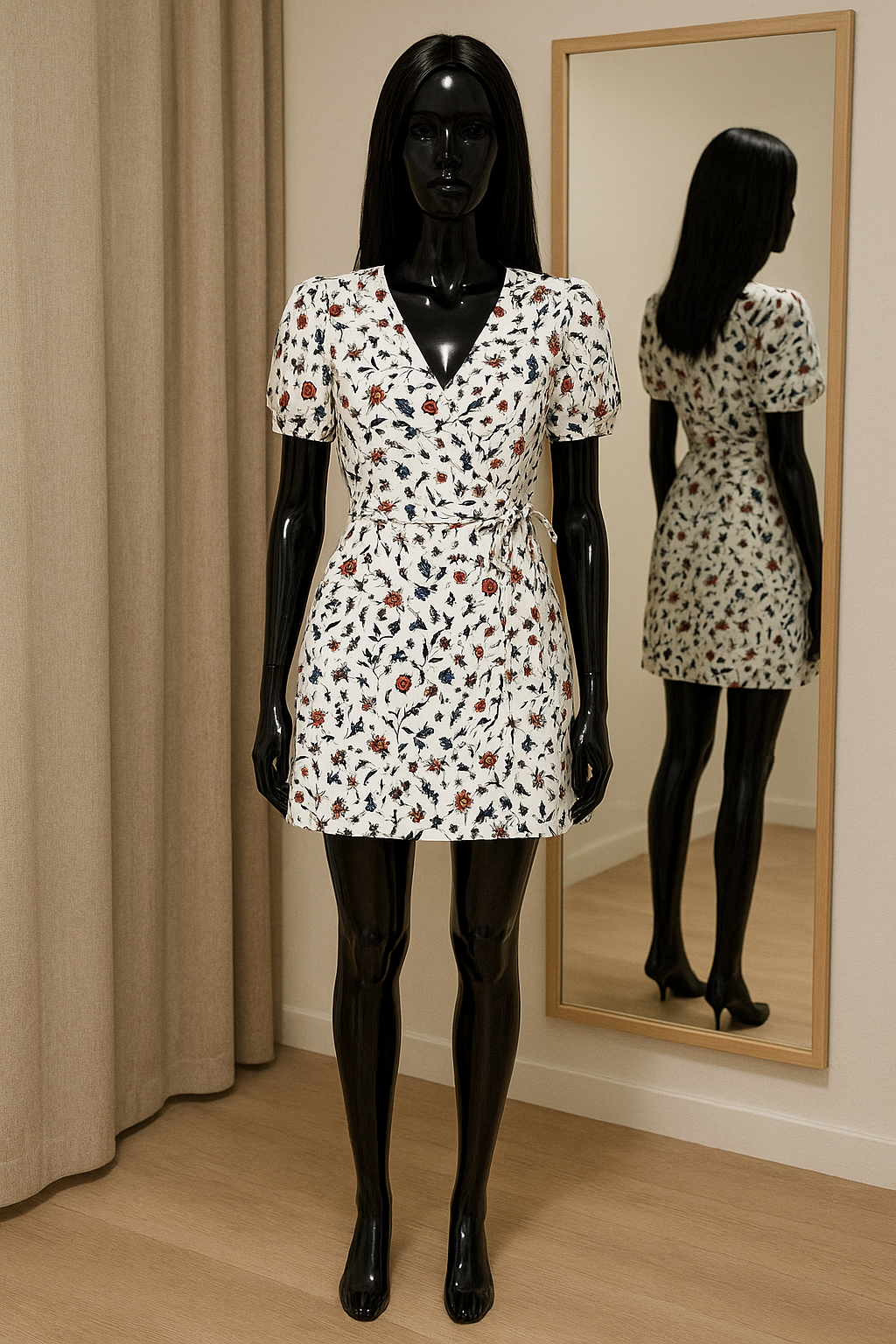 un mannequin noir brillant en plastique, sans traits du visage en Robe I.code debout, face à la caméra, avec une silhouette fine, dans une cabine d’essayage de style boutique avec un miroir et une décoration neutre.