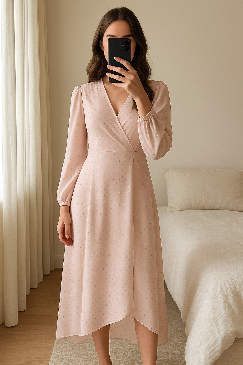 Robe élégante Marciano debout, face à la caméra, dans une chambre à la lumière douce, avec une lumière naturelle filtrant par la fenêtre.