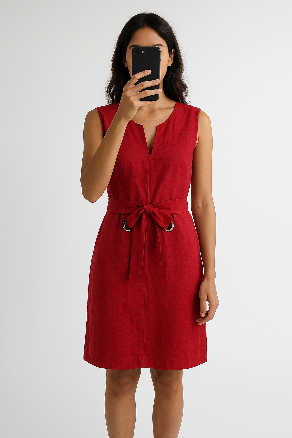 Une personne en Robe lin rouge cyrillus debout, face à la caméra, avec une silhouette fine, dans un studio photo épuré avec fond blanc et éclairage doux.