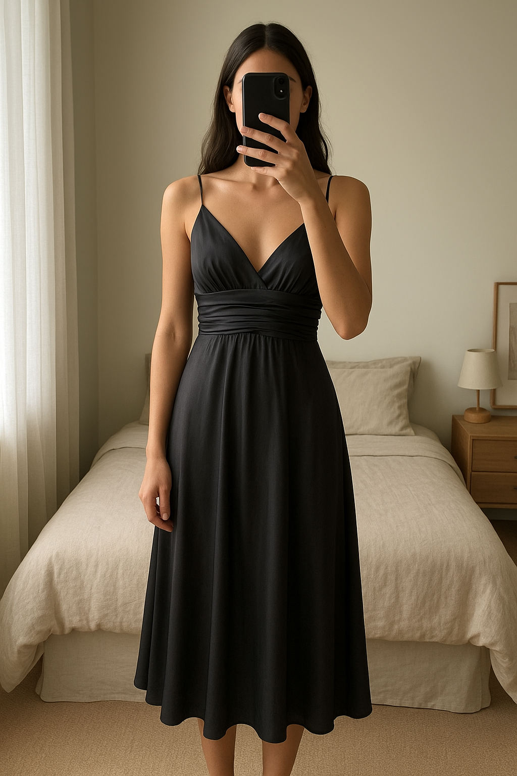 Robe longue Ba&sh satin debout, face à la caméra, dans une chambre à la lumière douce, avec une lumière naturelle filtrant par la fenêtre.
