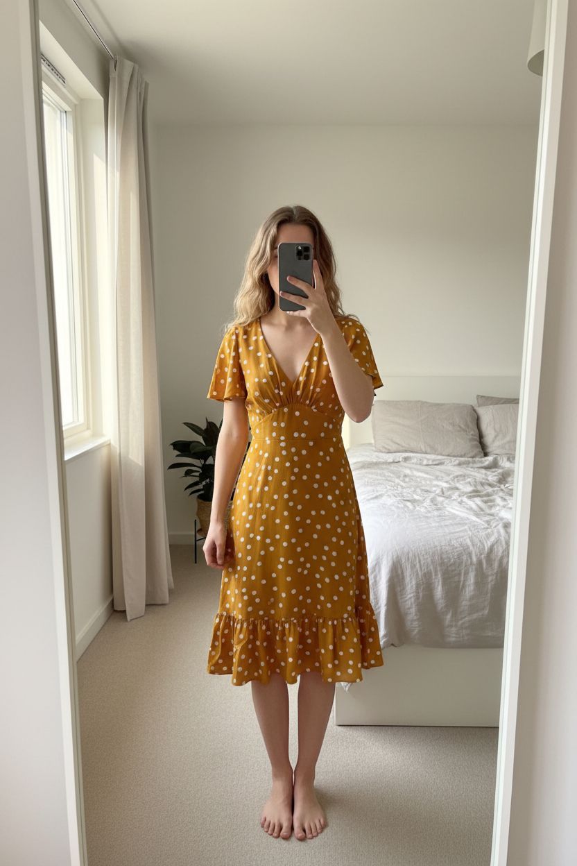 Robe longue d’été debout, face à la caméra, dans une chambre à la lumière douce, avec une lumière naturelle filtrant par la fenêtre.