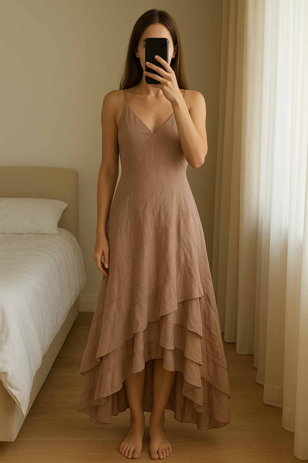 Robe longue de cocktail ou soirée beige debout, face à la caméra, dans une chambre à la lumière douce, avec une lumière naturelle filtrant par la fenêtre.