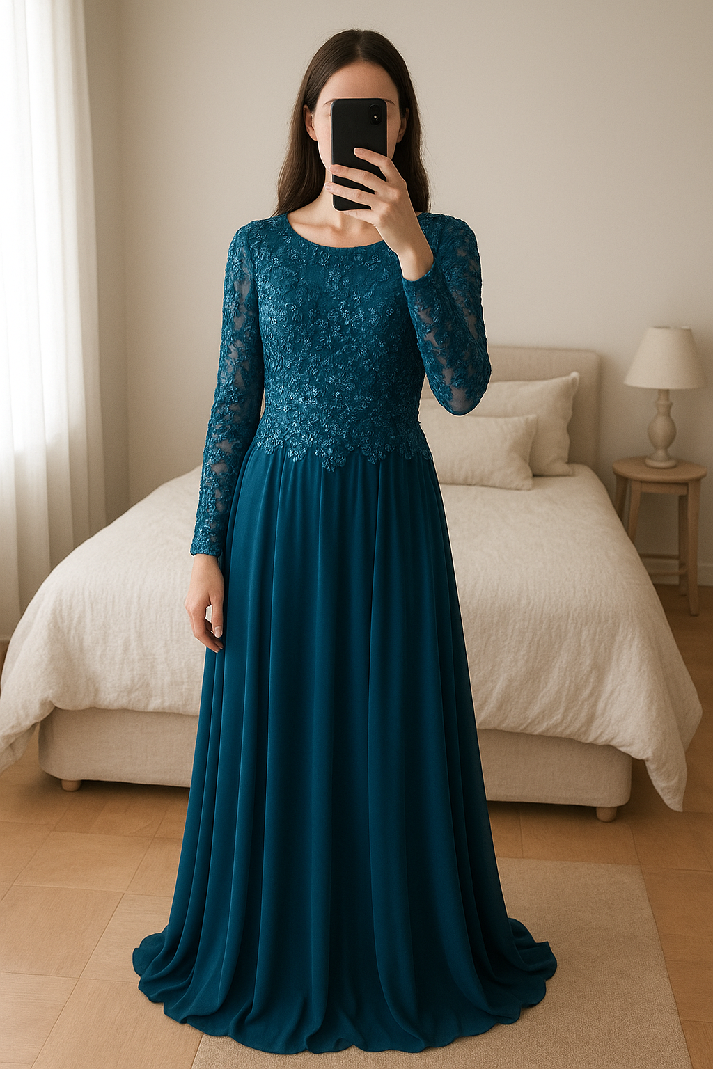 Une personne en Robe longue orientale XL debout, face à la caméra, dans une chambre à la lumière douce, avec une lumière naturelle filtrant par la fenêtre.