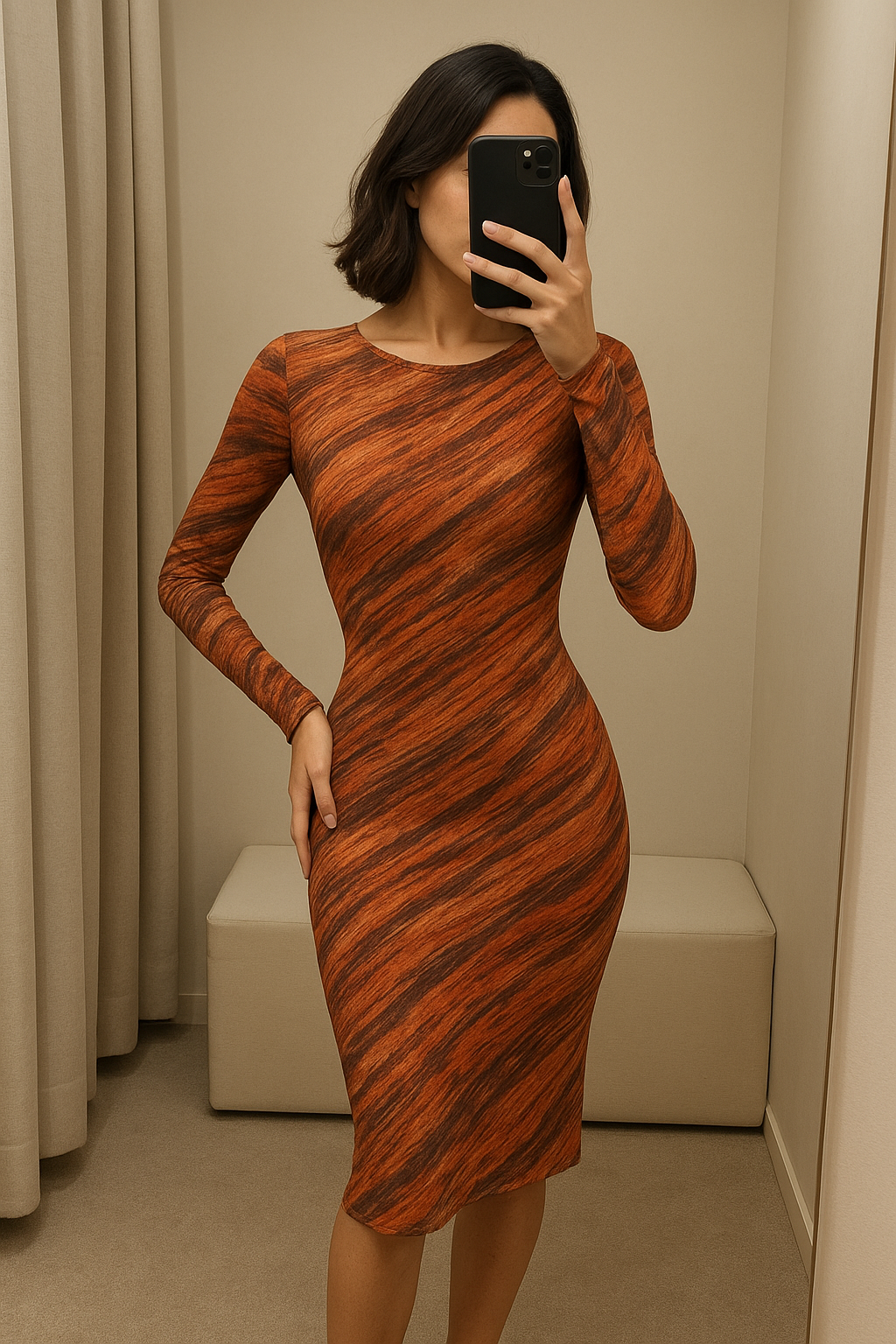 Une personne en Robe longue transparente Mim cambrant légèrement le dos pour une pose dynamique, dans une cabine d’essayage de style boutique avec un miroir et une décoration neutre.