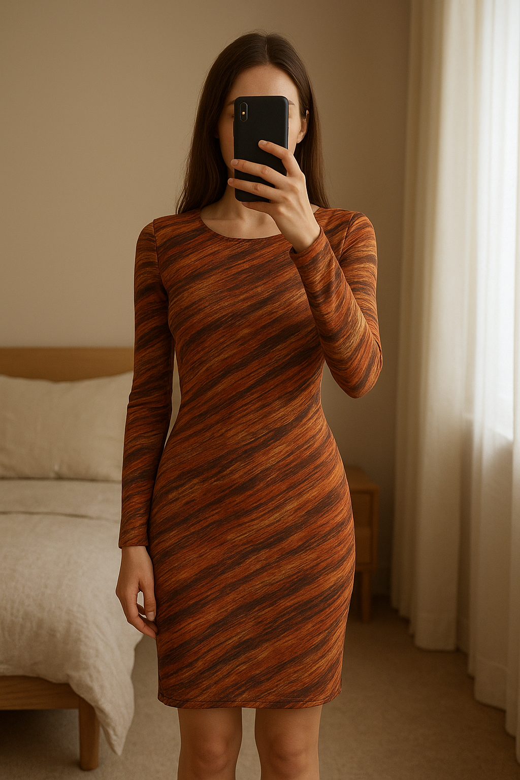 Robe longue transparente Mim debout, face à la caméra, dans une chambre à la lumière douce, avec une lumière naturelle filtrant par la fenêtre.