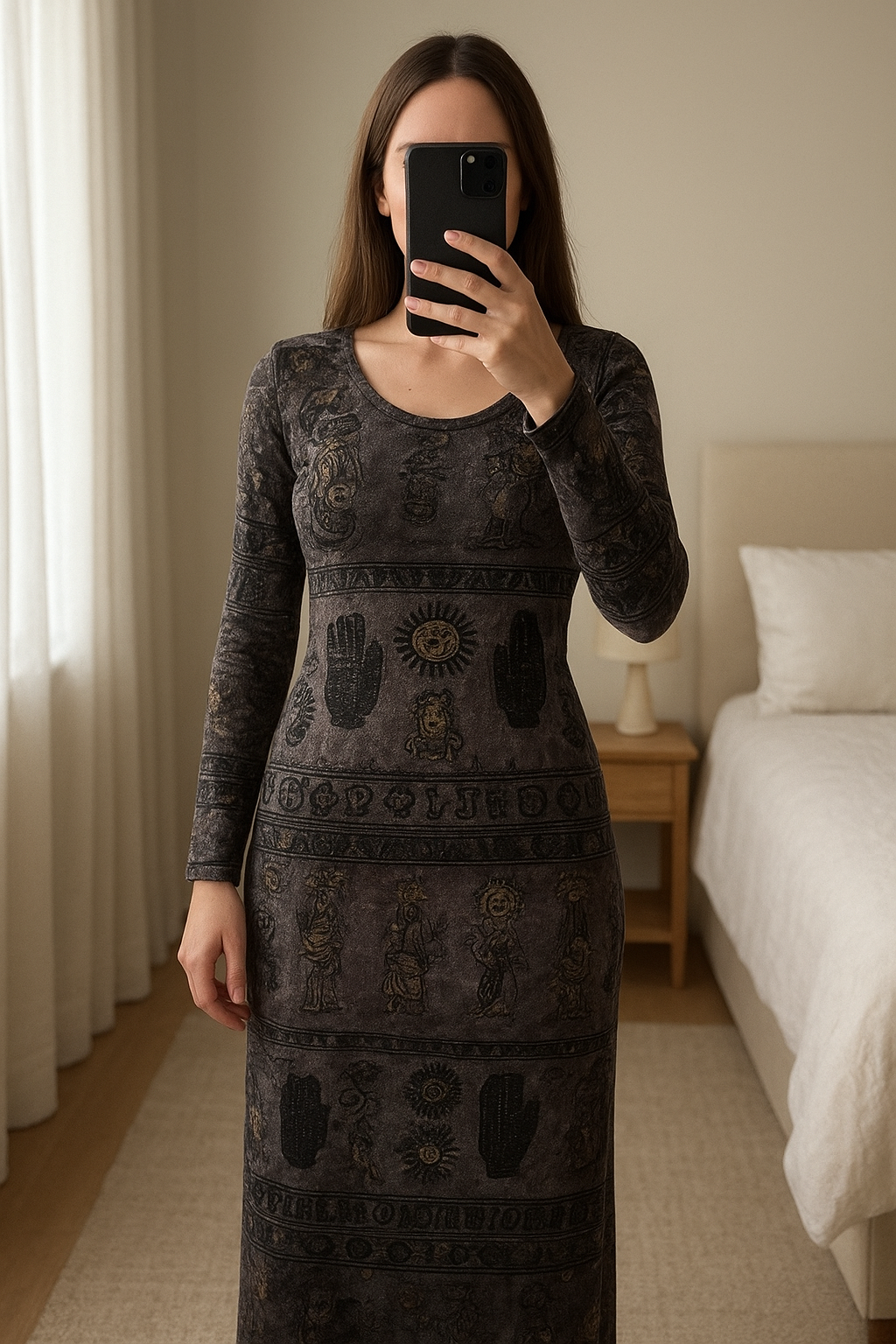 Robe longue vintage en velours velvet y2k rare debout, face à la caméra, dans une chambre à la lumière douce, avec une lumière naturelle filtrant par la fenêtre.