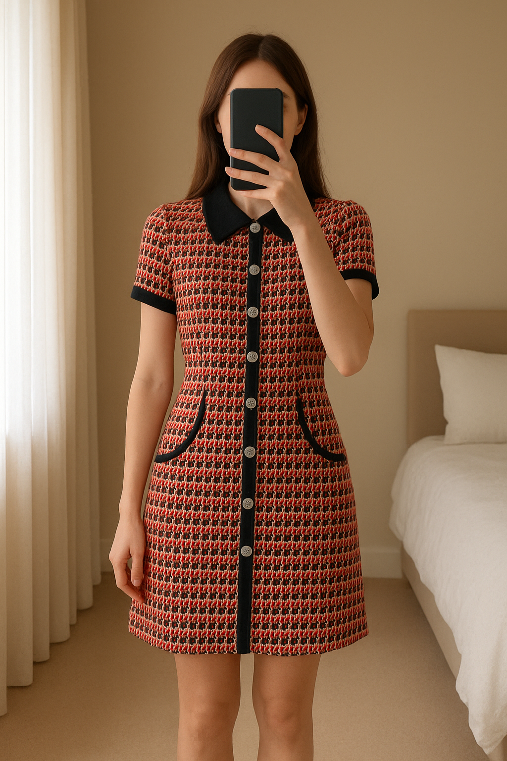 Robe Maje tweed rouge T36 neuf debout, face à la caméra, dans une chambre à la lumière douce, avec une lumière naturelle filtrant par la fenêtre.