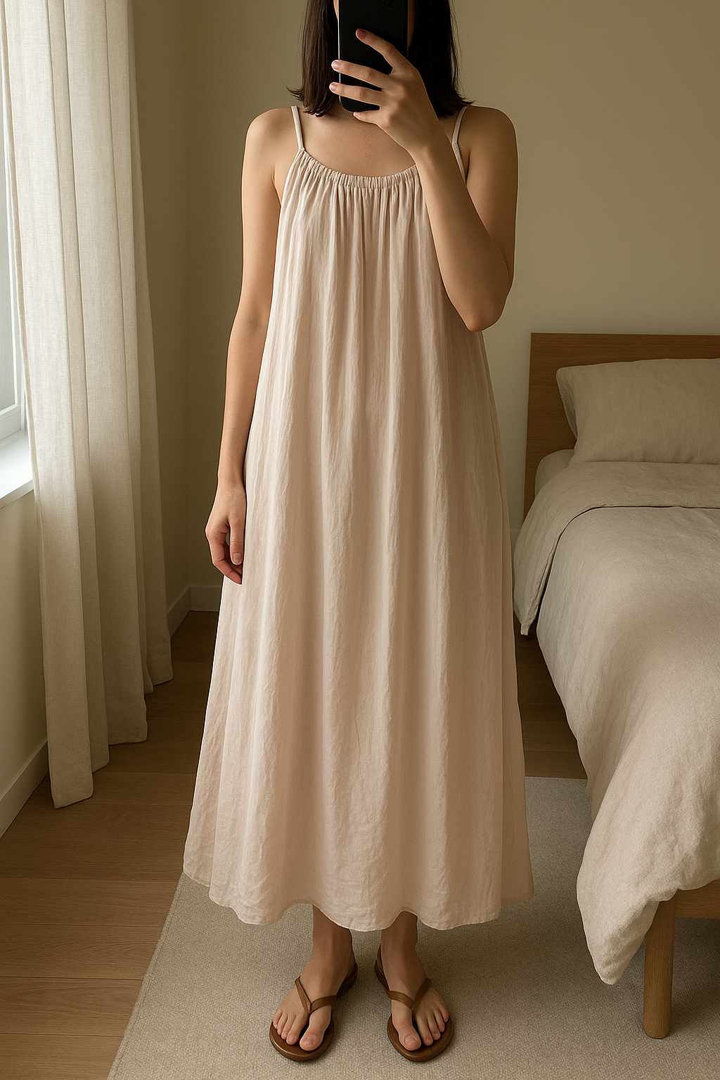 Robe missguided avec étiquette debout, face à la caméra, dans une chambre à la lumière douce, avec une lumière naturelle filtrant par la fenêtre.