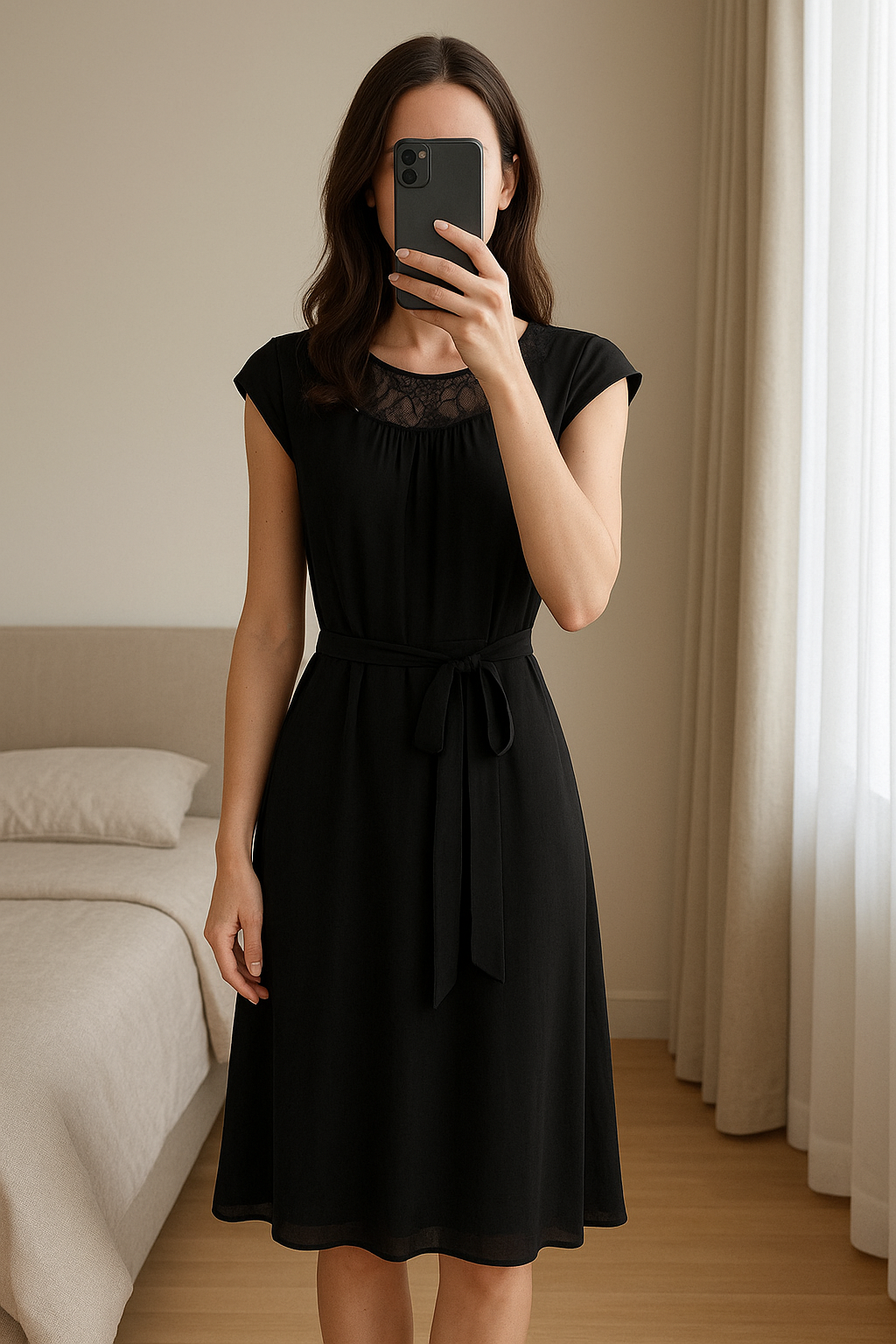 Robe noir mousline Bonobo xs cintré dos dentelle debout, face à la caméra, dans une chambre à la lumière douce, avec une lumière naturelle filtrant par la fenêtre.
