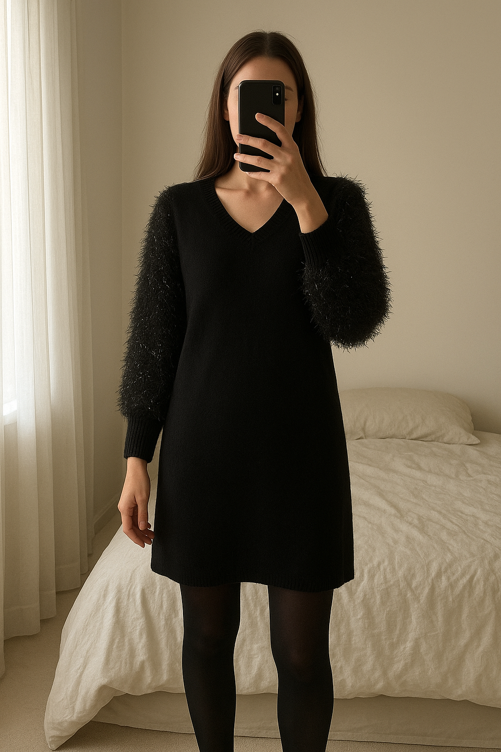 Robe noire brillante C.M.P.55 Taille S debout, face à la caméra, dans une chambre à la lumière douce, avec une lumière naturelle filtrant par la fenêtre.
