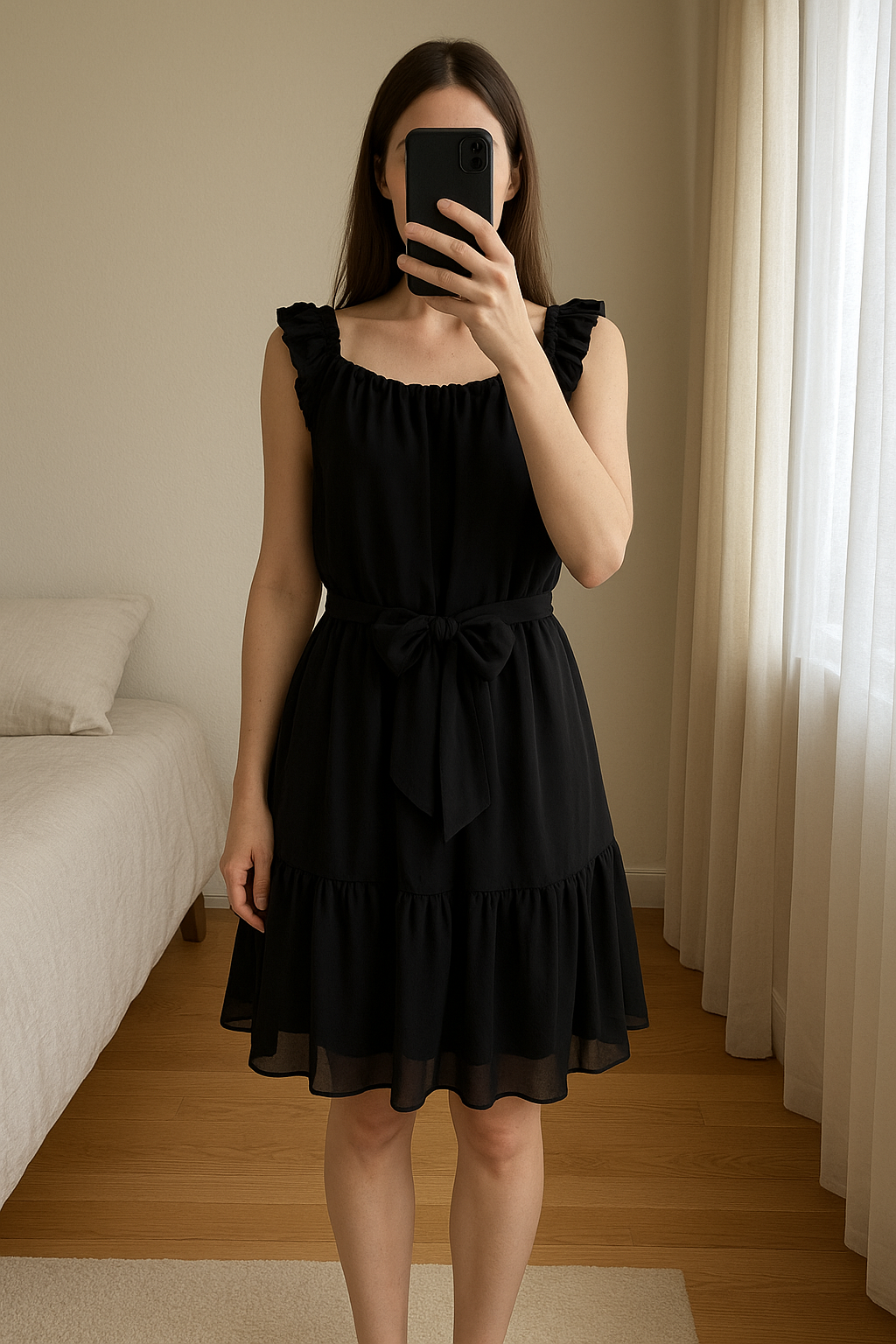 Robe noire en voile debout, face à la caméra, dans une chambre à la lumière douce, avec une lumière naturelle filtrant par la fenêtre.