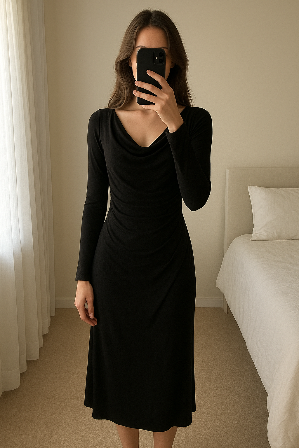 robe noire encolure V avec grand drapé devant debout, face à la caméra, dans une chambre à la lumière douce, avec une lumière naturelle filtrant par la fenêtre.