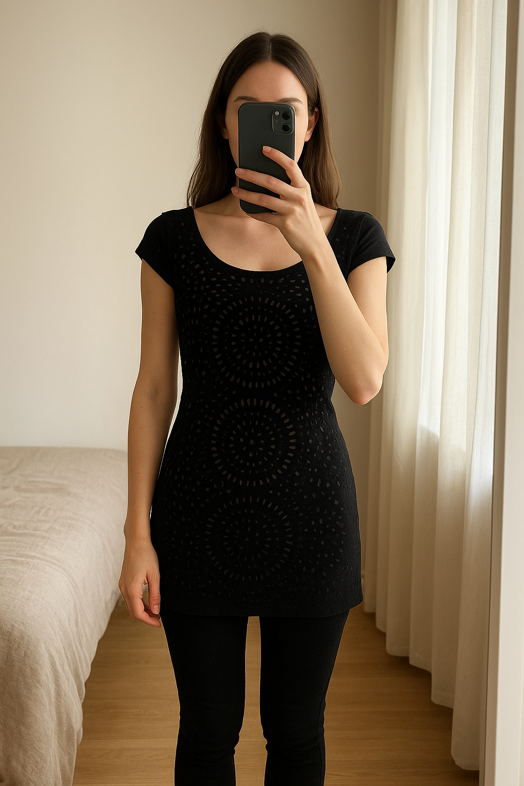 Robe noire femme debout, face à la caméra, dans une chambre à la lumière douce, avec une lumière naturelle filtrant par la fenêtre.
