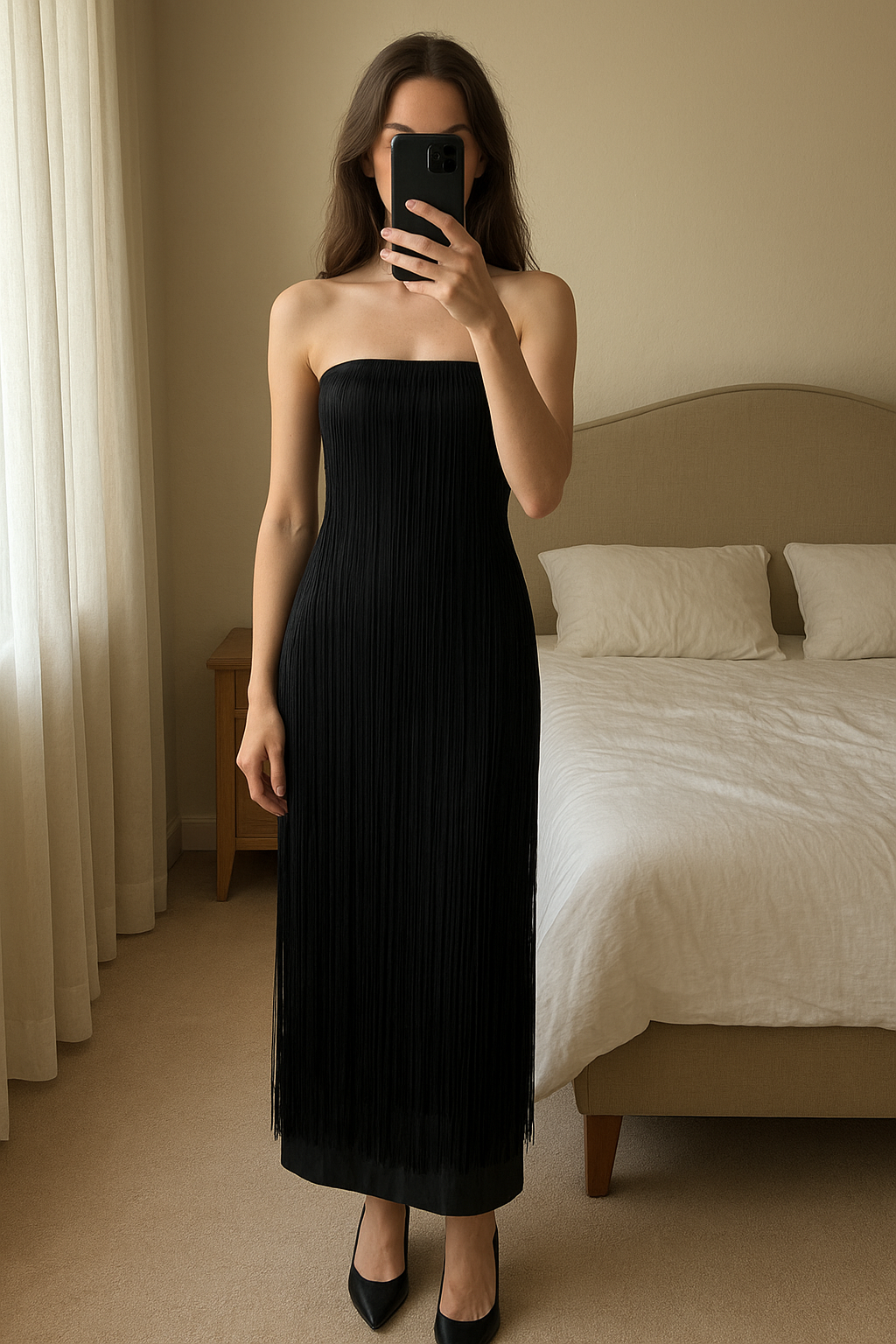 Robe noire à franges – style Charleston moderne – Taille S debout, face à la caméra, dans une chambre à la lumière douce, avec une lumière naturelle filtrant par la fenêtre.