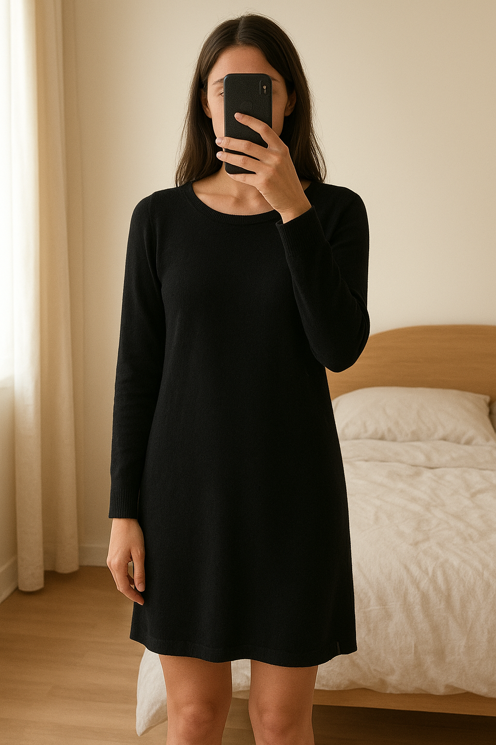 Robe noire LPB Les Petites Bombes – Taille S/M – Made in France debout, face à la caméra, dans une chambre à la lumière douce, avec une lumière naturelle filtrant par la fenêtre.