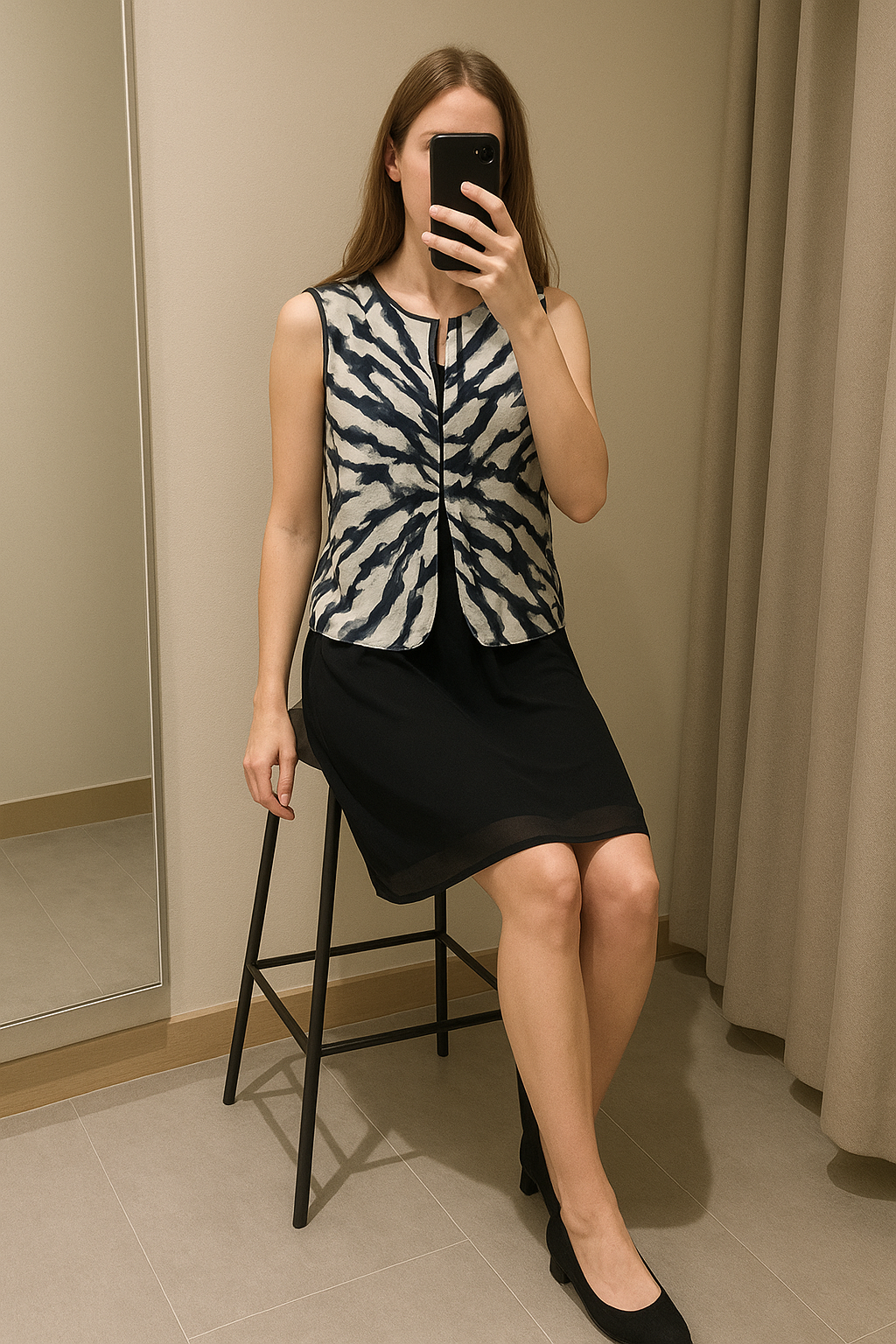 Une personne en robe noire à motif assis sur une chaise haute, avec une posture détendue, avec une silhouette fine, dans une cabine d’essayage de style boutique avec un miroir et une décoration neutre.