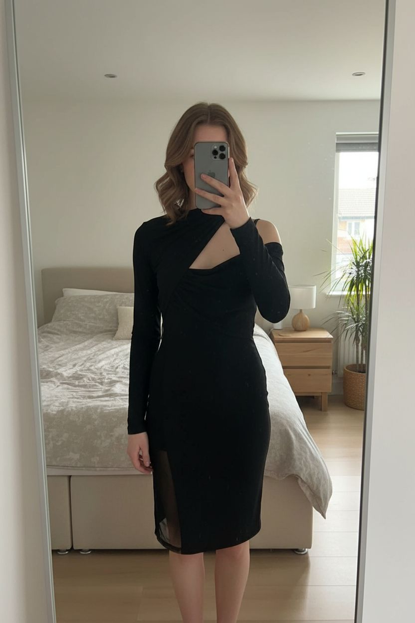 Robe noire Nensi Dojaka taille S neuve debout, face à la caméra, dans une chambre à la lumière douce, avec une lumière naturelle filtrant par la fenêtre.