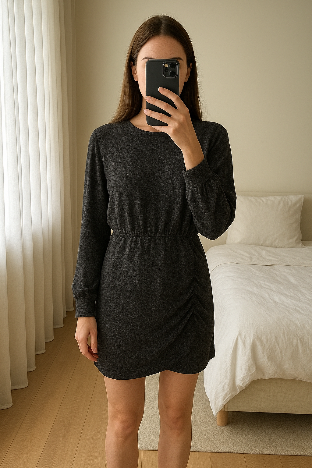 Robe pailletée Camaïeu – Taille XL – Parfaite pour les fêtes ! debout, face à la caméra, dans une chambre à la lumière douce, avec une lumière naturelle filtrant par la fenêtre.