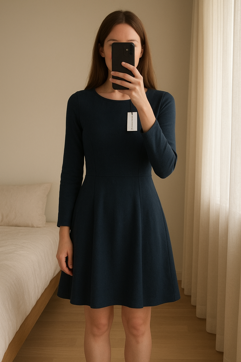 Robe petit bateau col bateau S bleue marine debout, face à la caméra, dans une chambre à la lumière douce, avec une lumière naturelle filtrant par la fenêtre.