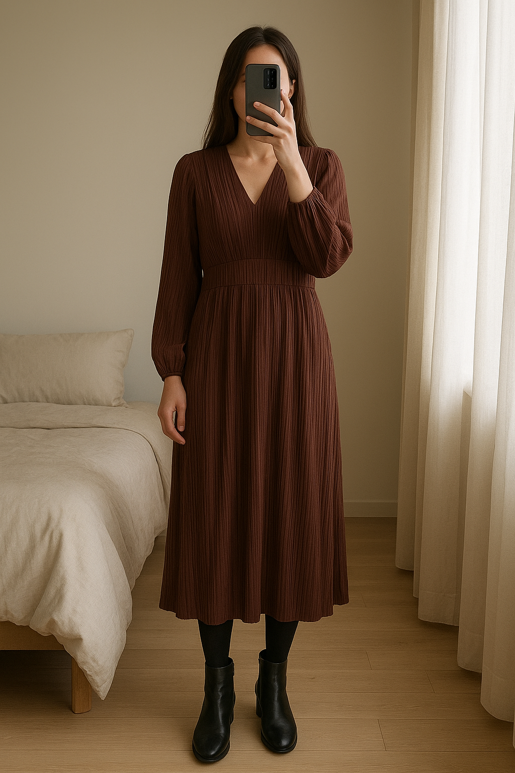 Robe plissée debout, face à la caméra, dans une chambre à la lumière douce, avec une lumière naturelle filtrant par la fenêtre.