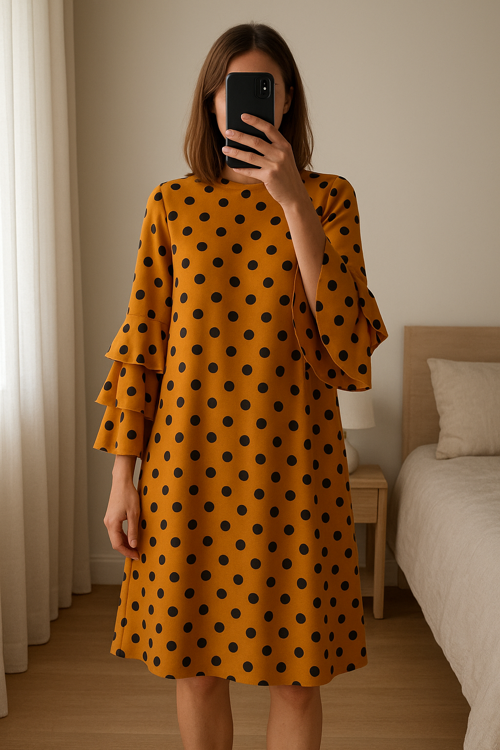 Robe à pois debout, face à la caméra, dans une chambre à la lumière douce, avec une lumière naturelle filtrant par la fenêtre.