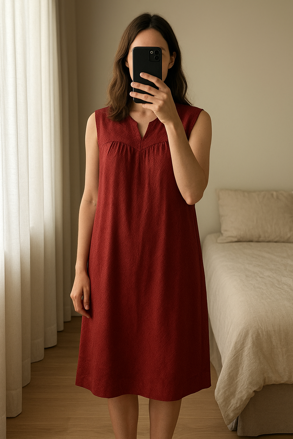 Robe rouge bordeaux effet croco debout, face à la caméra, dans une chambre à la lumière douce, avec une lumière naturelle filtrant par la fenêtre.