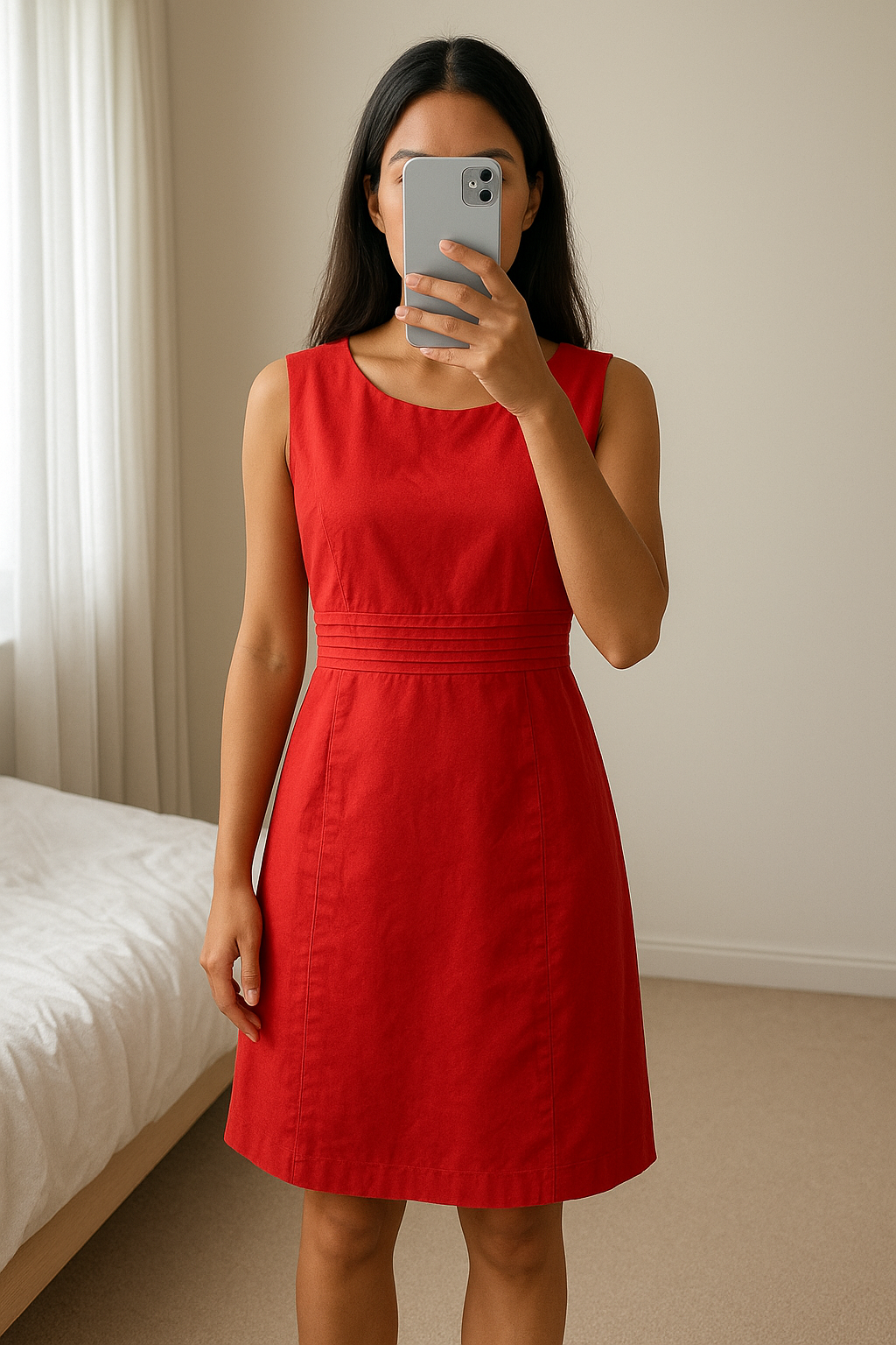 Une personne en Robe rouge cintrée col rond sans manches évasée coupe patineuse debout, face à la caméra, dans une chambre à la lumière douce, avec une lumière naturelle filtrant par la fenêtre.
