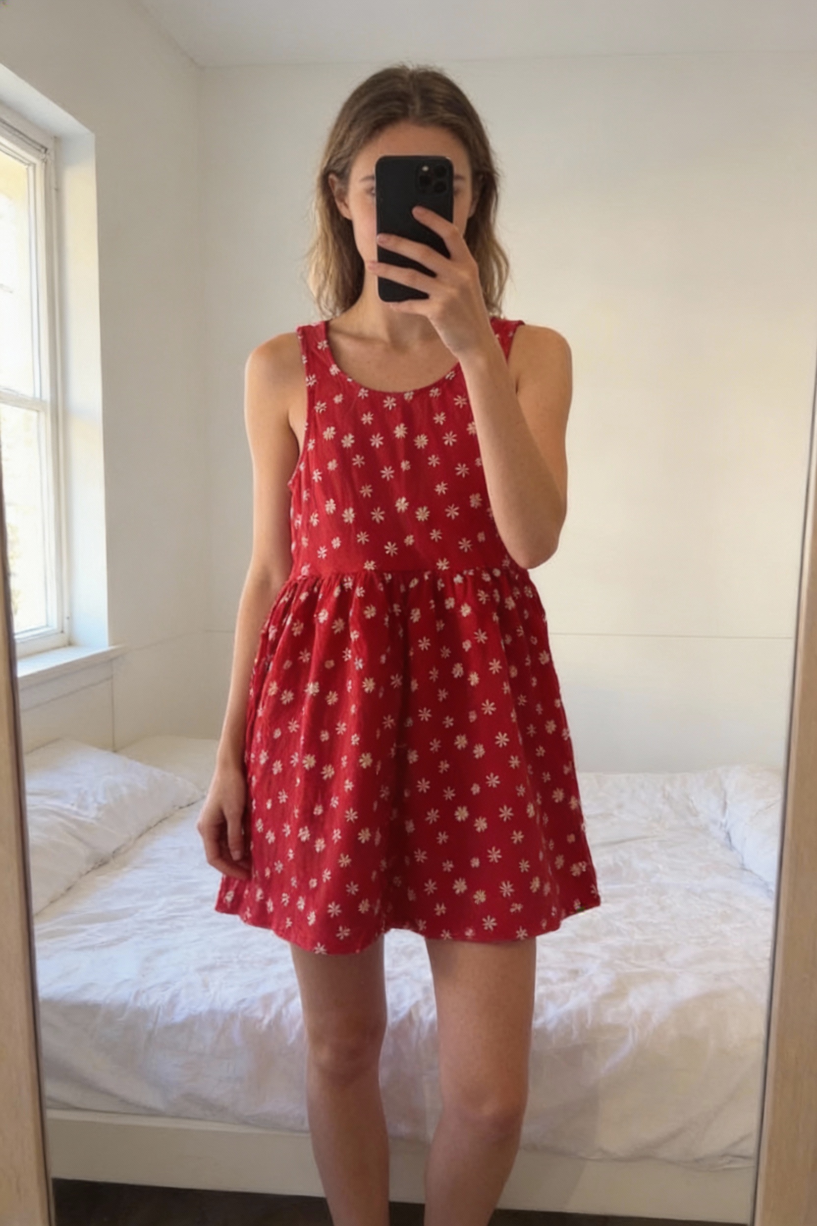 🌸 Robe rouge à fleurs KIABI – Taille 12A (144–155 cm) debout, face à la caméra, dans une chambre à la lumière douce, avec une lumière naturelle filtrant par la fenêtre.