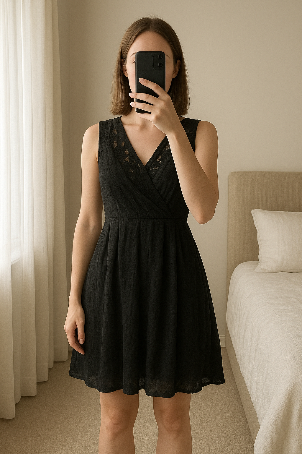 Robe satinée a dentelle taille s debout, face à la caméra, dans une chambre à la lumière douce, avec une lumière naturelle filtrant par la fenêtre.
