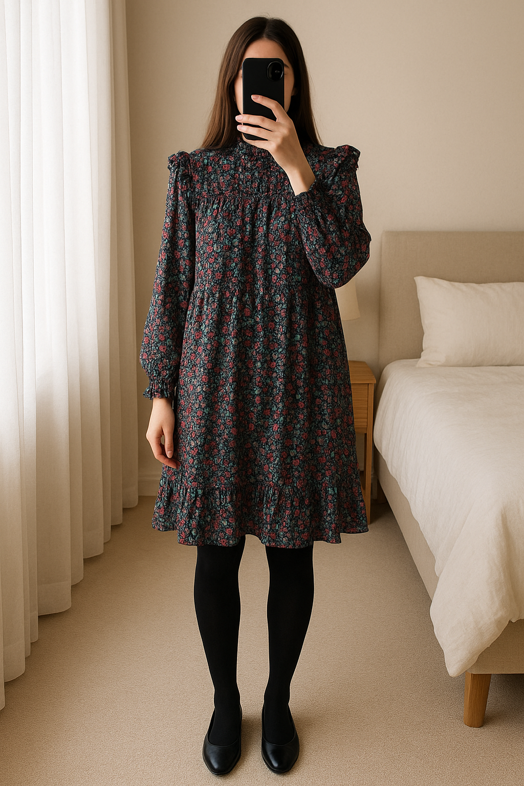 Robe Springfield volants Taille 38 debout, face à la caméra, dans une chambre à la lumière douce, avec une lumière naturelle filtrant par la fenêtre.