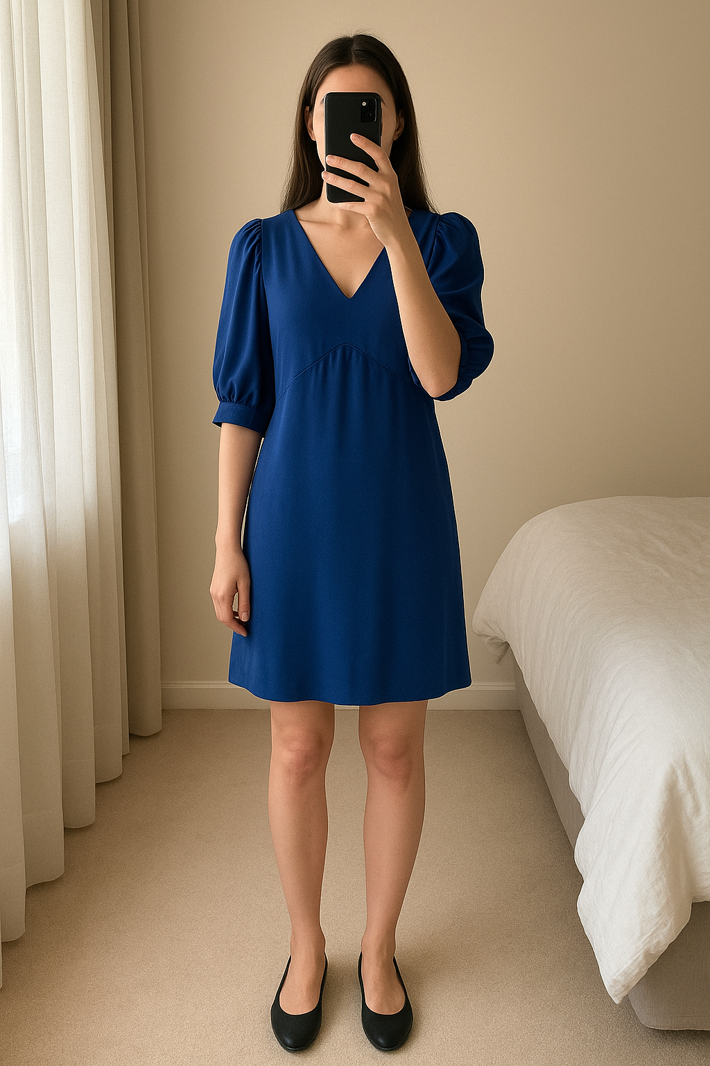 Robe stella mc cartney debout, face à la caméra, dans une chambre à la lumière douce, avec une lumière naturelle filtrant par la fenêtre.