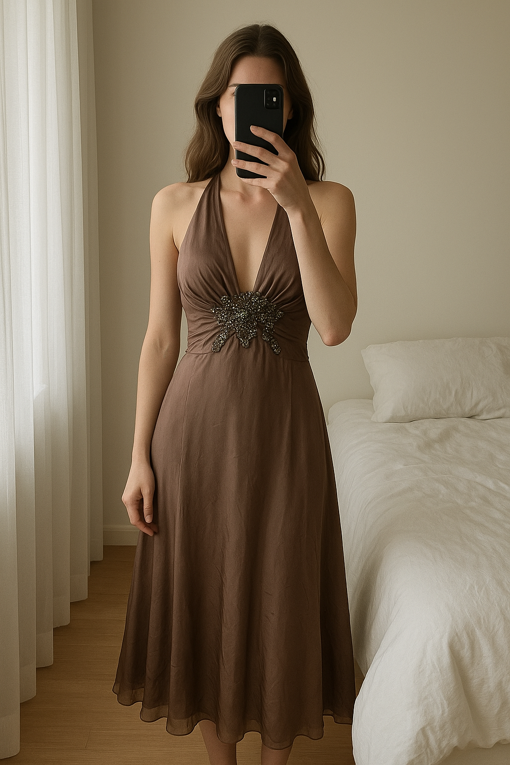 Robe taille 38 / vestido talla M de pie, mirando a la cámara, en un dormitorio con luz suave y natural filtrándose por la ventana.