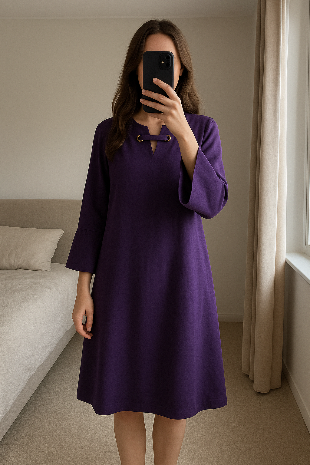 Robe violette Cassis – Taille XL debout, face à la caméra, dans une chambre à la lumière douce, avec une lumière naturelle filtrant par la fenêtre.