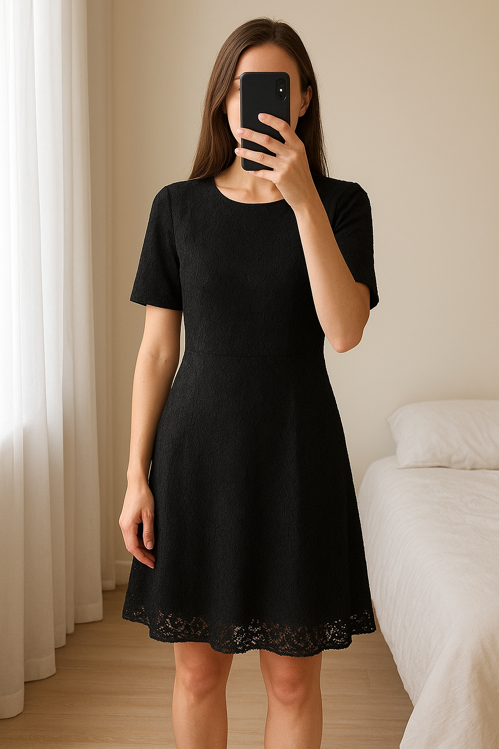 Robe Zapa dentelle debout, face à la caméra, dans une chambre à la lumière douce, avec une lumière naturelle filtrant par la fenêtre.