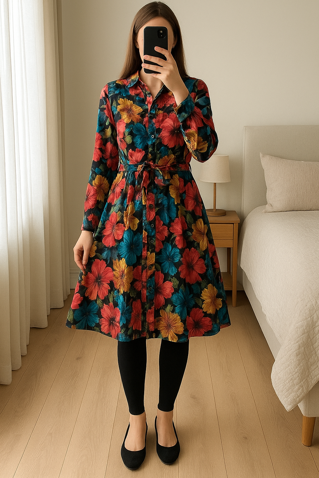 Robe Zara debout, face à la caméra, dans une chambre à la lumière douce, avec une lumière naturelle filtrant par la fenêtre.
