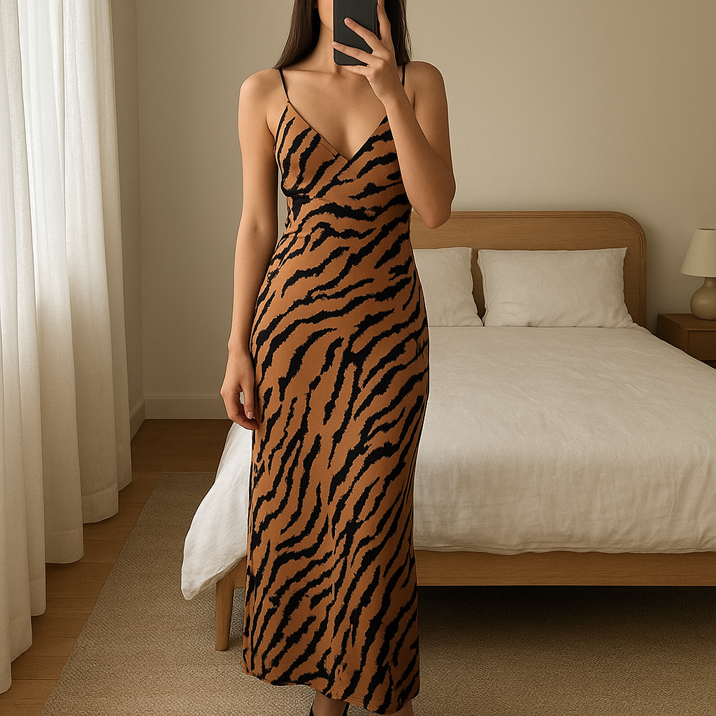 Robe Zara T34 debout, face à la caméra, dans une chambre à la lumière douce, avec une lumière naturelle filtrant par la fenêtre.