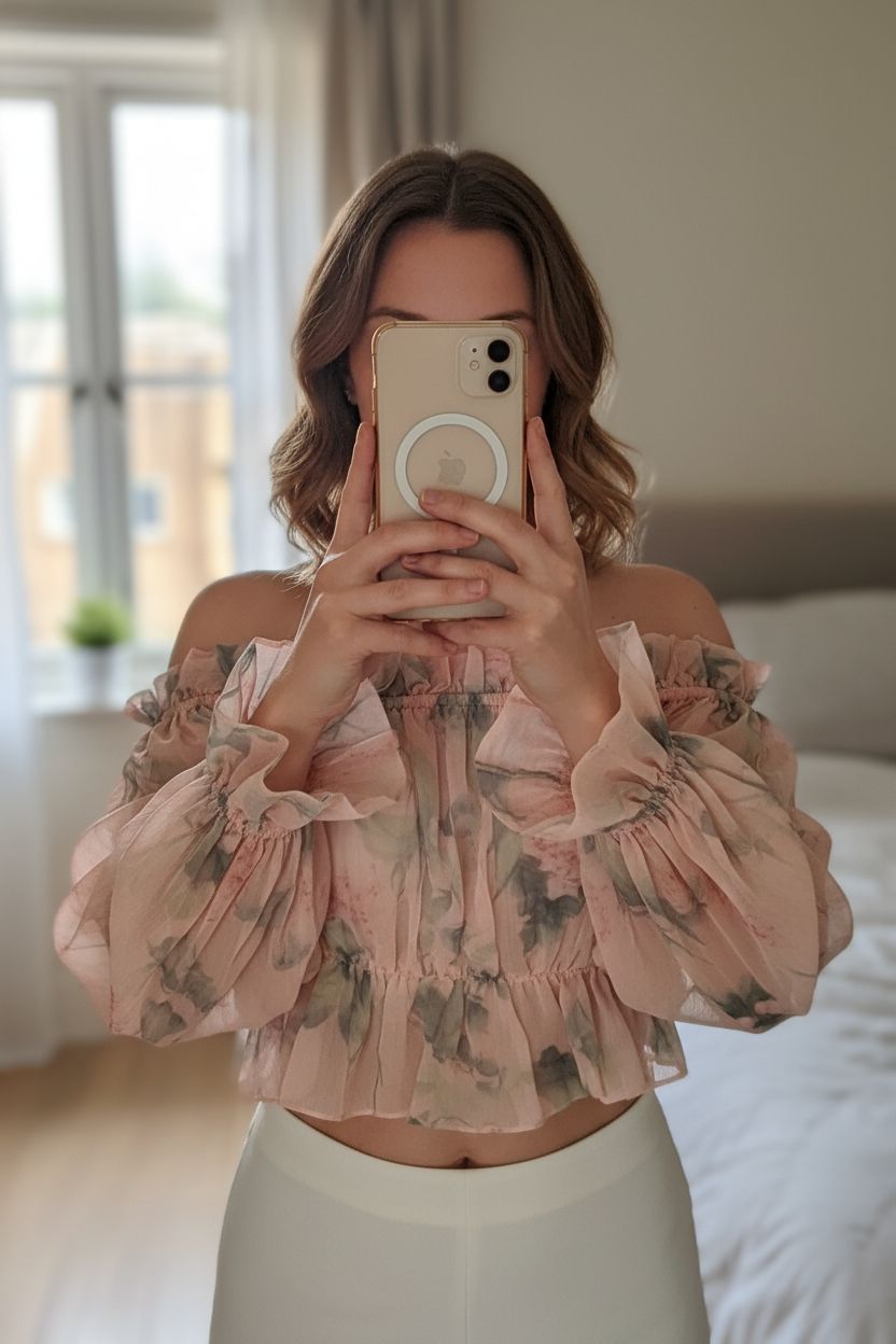 Eine Person in Romantische Off-Shoulder Bluse mit Volants – floral, luftig & verspielt Größe S/M/38 aufrecht stehend, der Kamera zugewandt, in einem sanft beleuchteten Schlafzimmer, mit natürlichem Licht, das durch ein Fenster fällt.