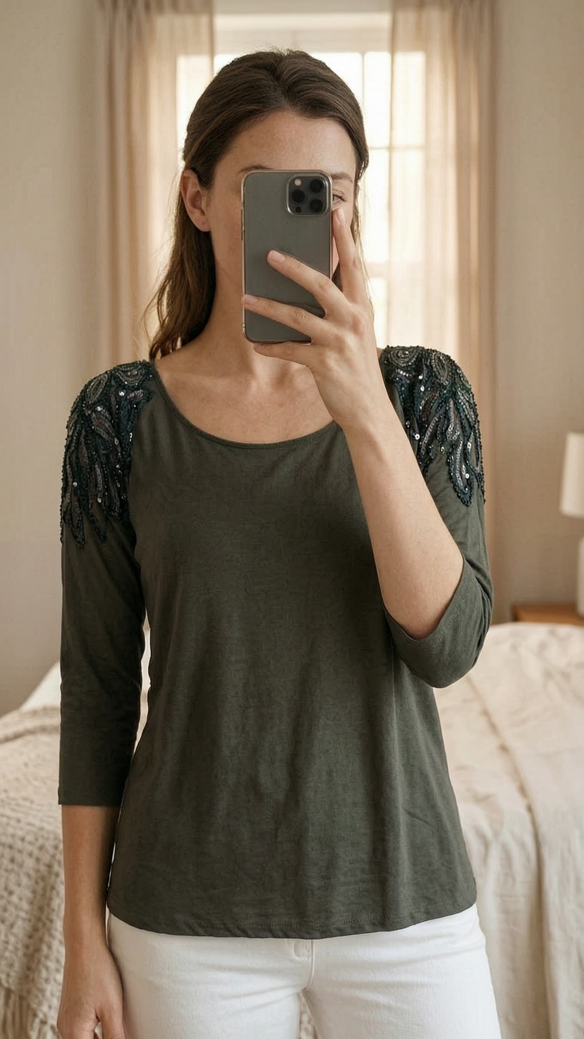 Romeo & Juliet Couture Shirt M Olivgrün mit Pailletten 3/4 Arm aufrecht stehend, der Kamera zugewandt, in einem sanft beleuchteten Schlafzimmer, mit natürlichem Licht, das durch ein Fenster fällt.
