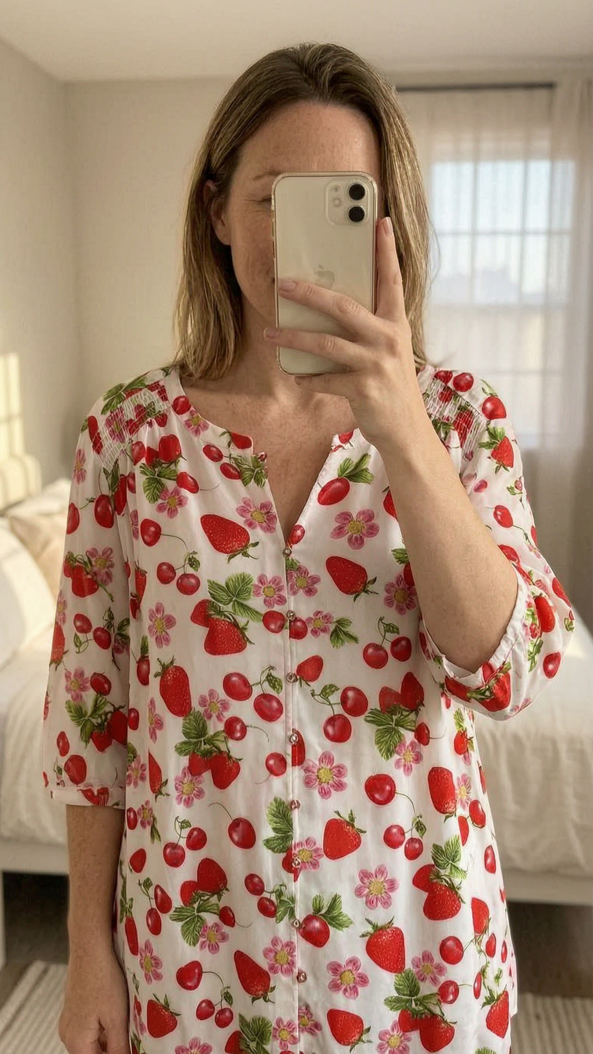 Rose + Olive weiße Bluse mit Erdbeermuster aufrecht stehend, der Kamera zugewandt, in einem sanft beleuchteten Schlafzimmer, mit natürlichem Licht, das durch ein Fenster fällt.