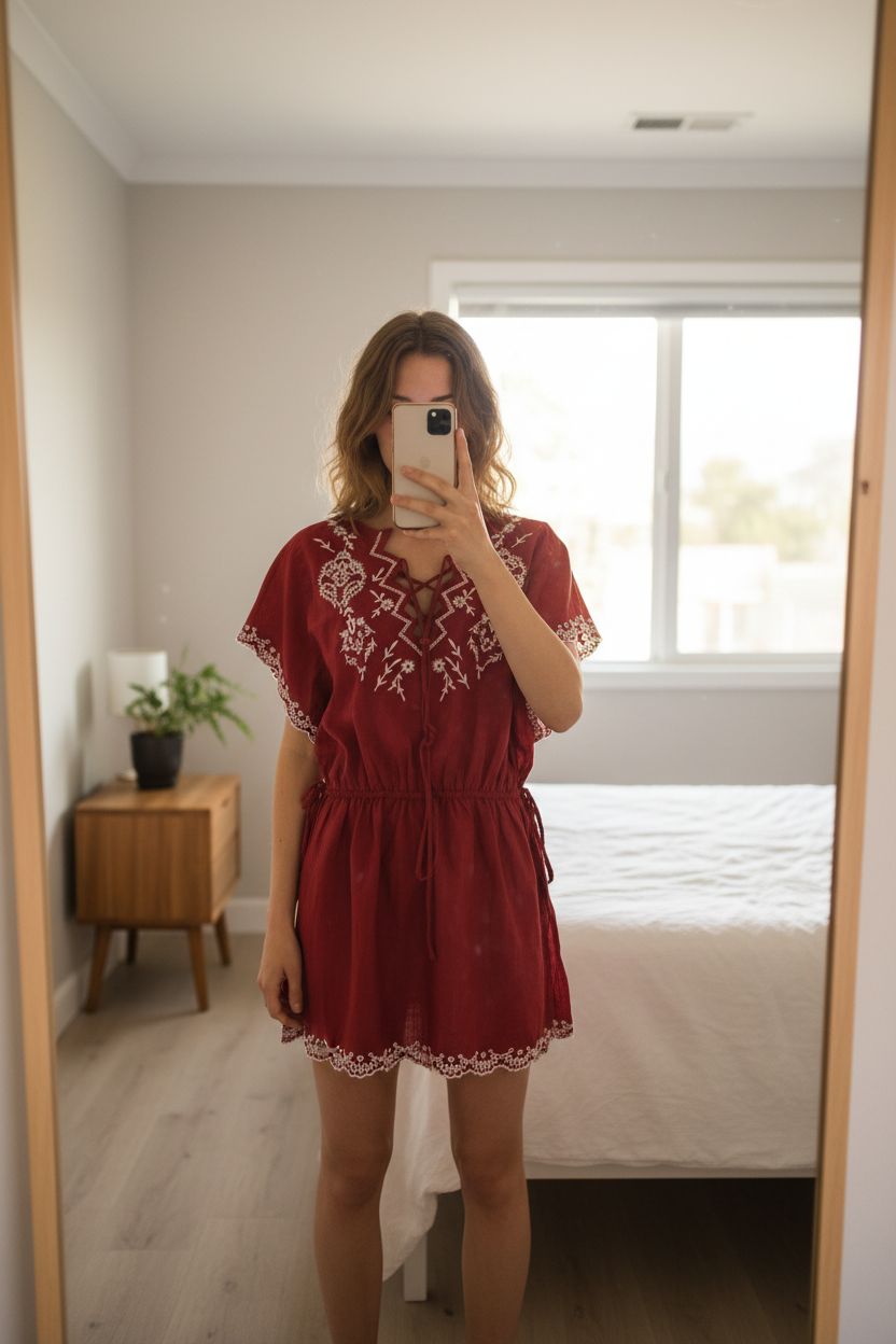 Rote Boho Tunika mit Stickerei – Sommer, Urlaub & Beach Look River Island Größe L aufrecht stehend, der Kamera zugewandt, in einem sanft beleuchteten Schlafzimmer, mit natürlichem Licht, das durch ein Fenster fällt.