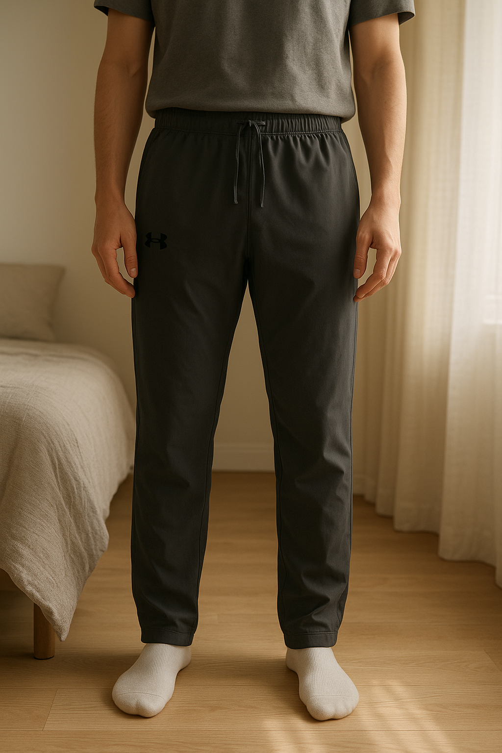Running Under Armour Gris debout, face à la caméra, dans une chambre à la lumière douce, avec une lumière naturelle filtrant par la fenêtre.