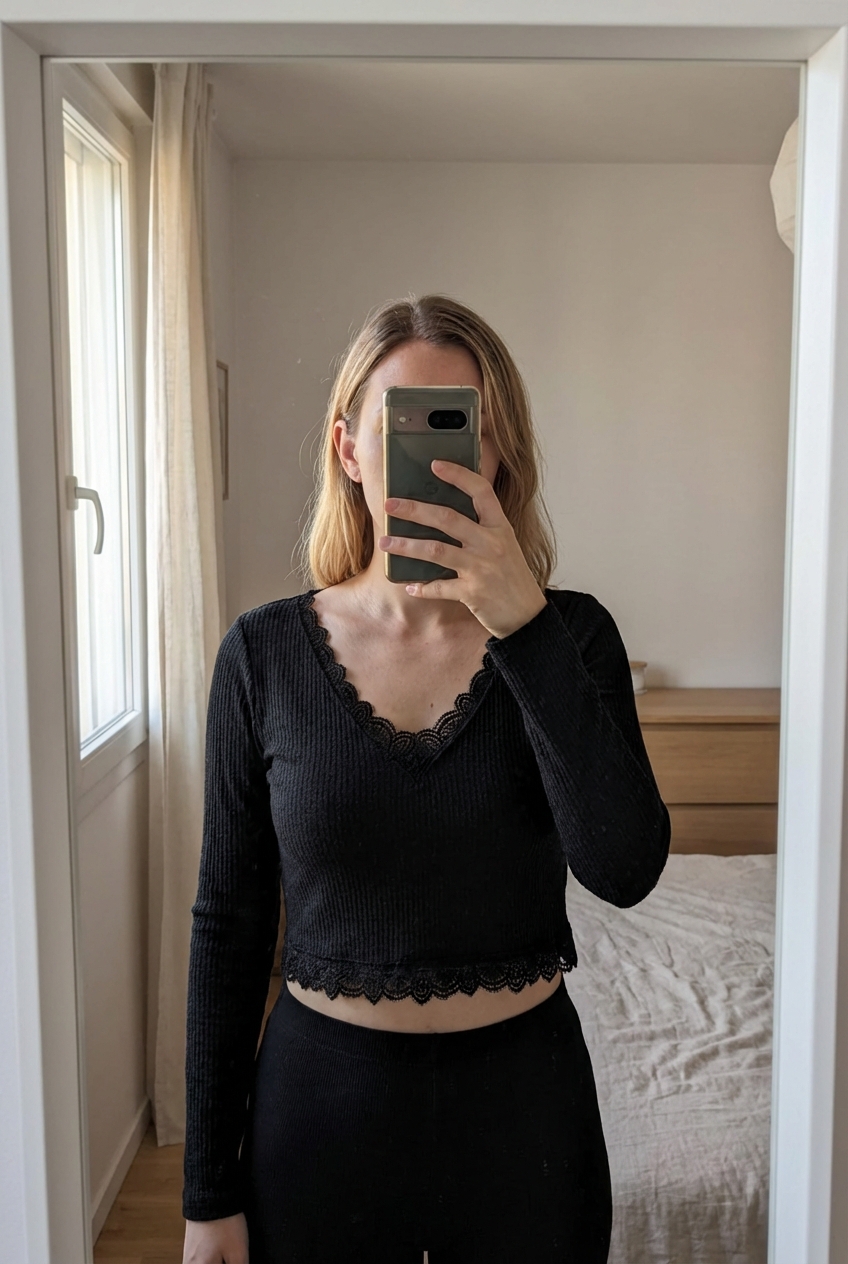 Süßer Crop Pullover mit Spitzendetail | Gr. 34 aufrecht stehend, der Kamera zugewandt, in einem sanft beleuchteten Schlafzimmer, mit natürlichem Licht, das durch ein Fenster fällt.